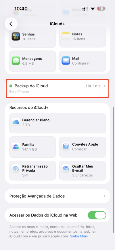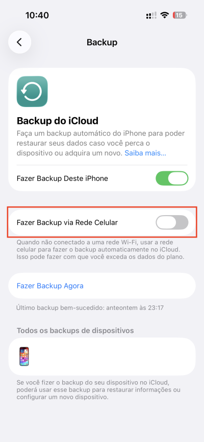 O backup do iCloud pode virar um vilão no consumo dos dados de celular! Configure para que ele aconteça apenas nas conexões WiFi.